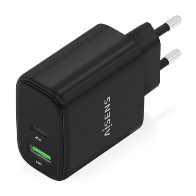AISENS Cargador GaN 45W, 1xUSB-C PD3.0 QC4.0, 1xUSB-A QC3.0, Negro